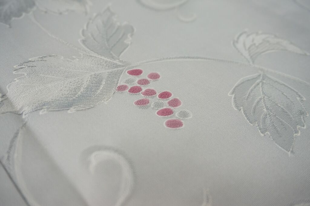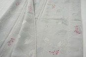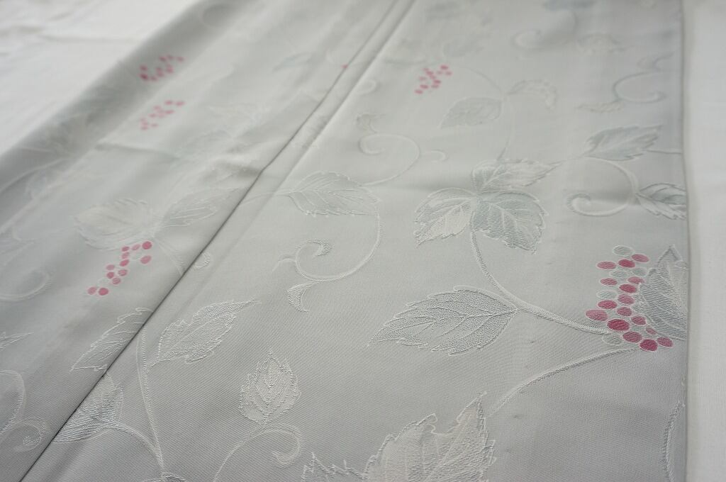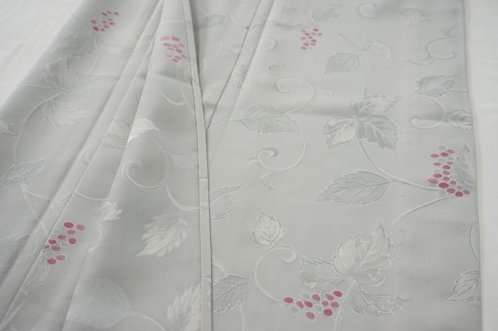 「伊と幸」が創業当時より最も力をいれた、立体的な紋意匠(承華縮緬)で、優美な唐草に葡萄を組み合わせた、古代中国より伝わる格調高い『葡萄唐草』を丹念に織り出し、その上に「手描き友禅」を繊細にあしらった、とても素敵な柄行です。