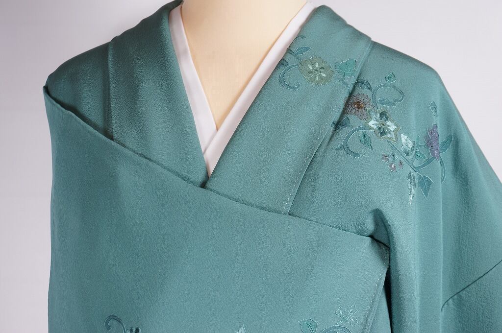 未使用 汕頭 相良 蘇州 総刺繍 訪問着 唐花 正絹 山藍摺 青緑 569