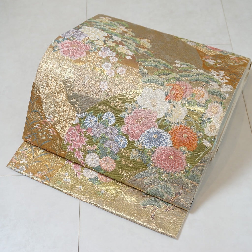 ■美しく輝く「金箔」をふんだんに使ったゴールド地に、ふっくらとした刺繍のような格調高い「唐織り」で、縁起の良い「吉祥文」の松・菊・牡丹や桔梗などの花々を、色鮮やかに細密に織り出し、扇に張る紙の「地紙」を配した、気品溢れる豪華な袋帯です。