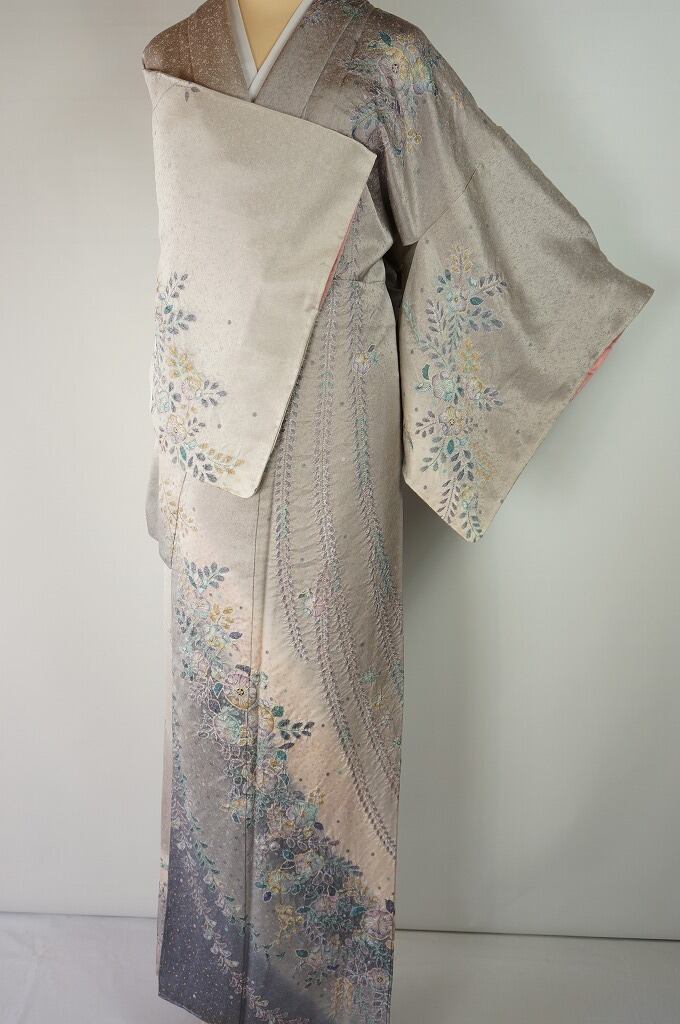 やわらかな「ぼかし染め」により、淡い紫から濃い紫への美しいグラデーションを大胆にあしらい、多彩な「友禅」「手絞り」「墨絵描き」を駆使し色鮮やかに彩られた「辻が花 」を散りばめ、ひとつひとつ細密な手絞りをふんだんに施した、うっとりするほど美しい見事な作品です。