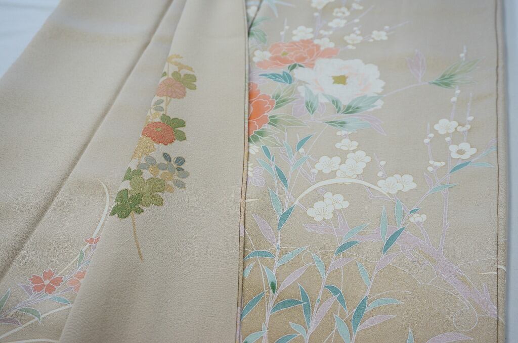 美品 京友禅 本金箔 吉祥花柄 訪問着 正絹 枯野 ベージュ 575