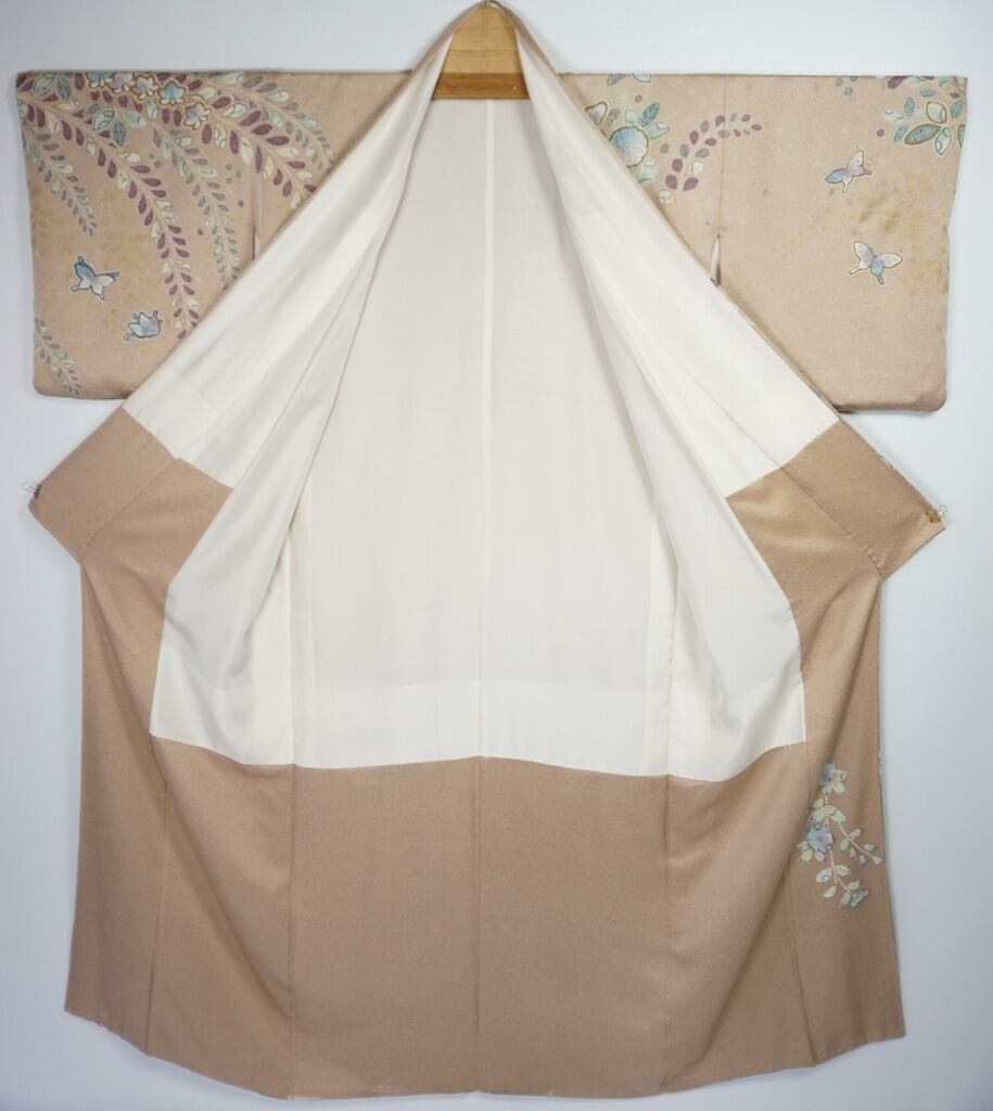 やわらかな「ぼかし染め」で、淡い黄緑から淡い茶色への美しいグラデーションを施し、「友禅」「手絞り」による優雅に枝垂れる「辻が花」を華麗に描き美しく蝶が舞い、上品に煌めく細かな「金彩」をあしらった、大変見事な柄行です。