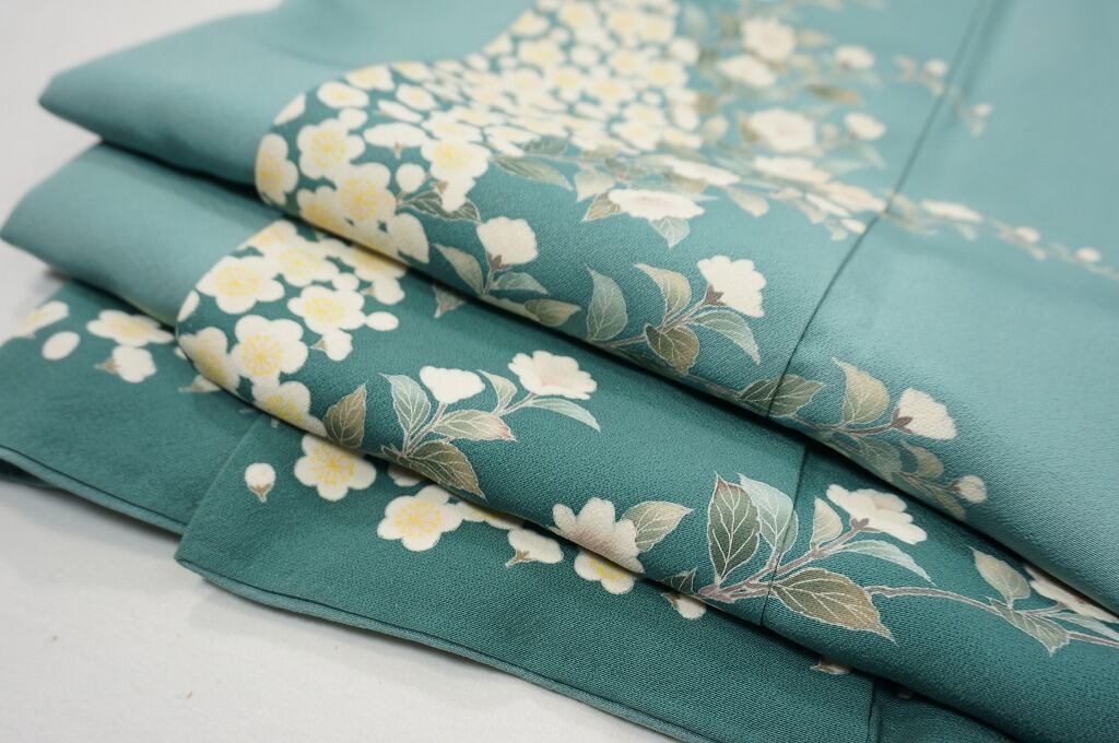 作家物 手描き友禅 丸洗い済 訪問着 花柄 椿 梅 山藍摺 青緑 589