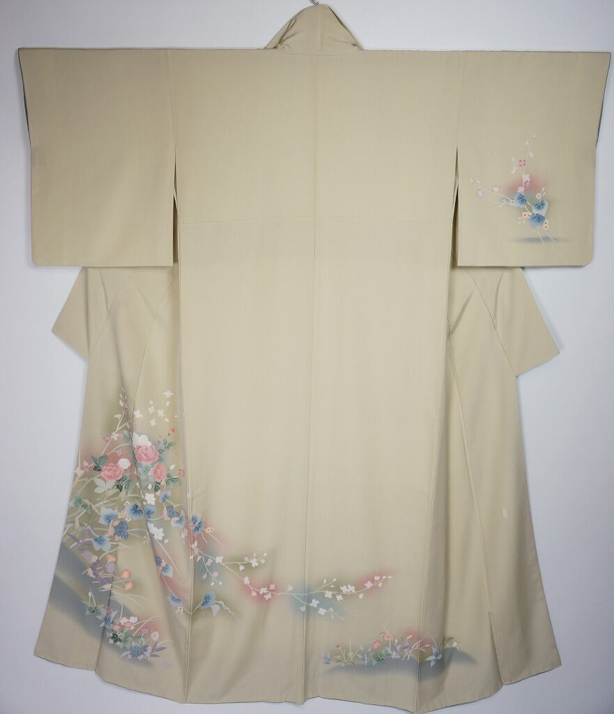 淡いピンクや水色のやわらかな「ぼかし染め」をあしらい、縁起の良い「吉祥文」の牡丹などの四季の花々に、優雅に枝垂れる桜を配し、繊細な「型染め友禅」で鮮やかに彩られ、金彩や金箔等使わずに友禅のみで描かれた、とても美しい柄行です。