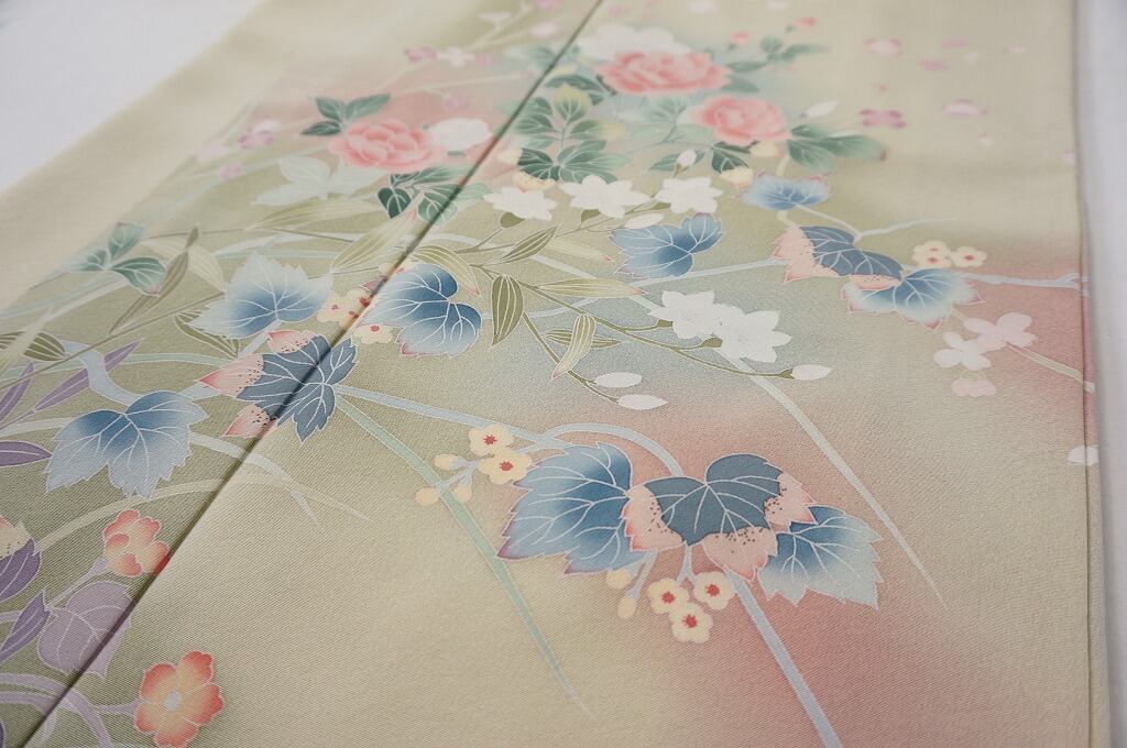 型染め友禅 吉祥花柄 訪問着 正絹 薄柳 黄緑 592