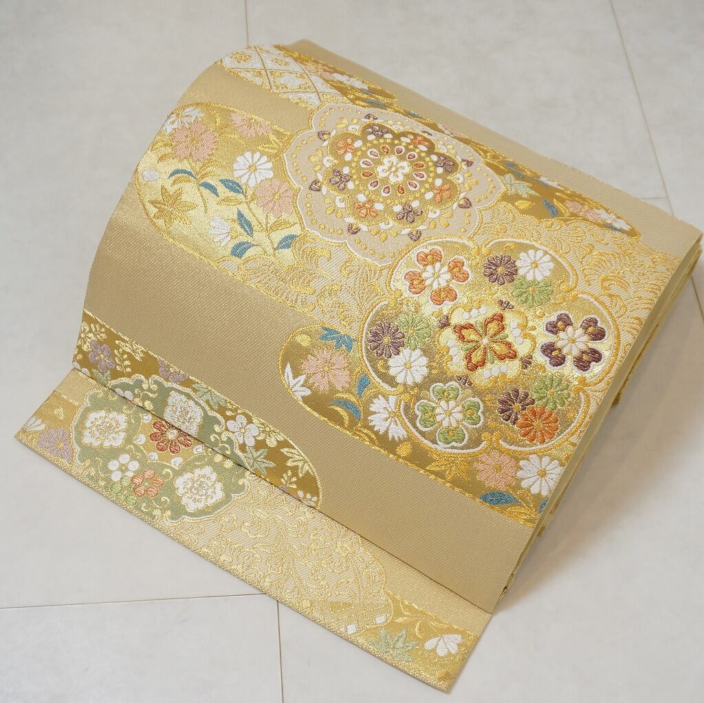 未使用 唐織り 金通し 華紋 袋帯 金糸 ゴールド ベージュ 295