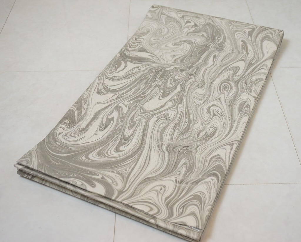 未使用 西陣織 墨流し染め 洒落袋帯 銀通し 正絹 グレー 白 300