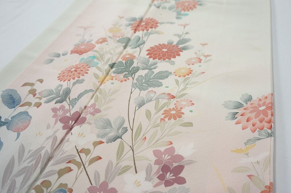 優しいピンク色でさりげない「ぼかし染め」を施し、縁起の良い「吉祥文」の菊や桔梗などの花々を、繊細な「手描き友禅」で葉や花びら一枚一枚丹念に描き、鮮やかに彩られた、うっとりするほど美しい作品です。