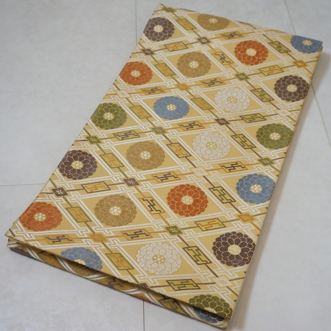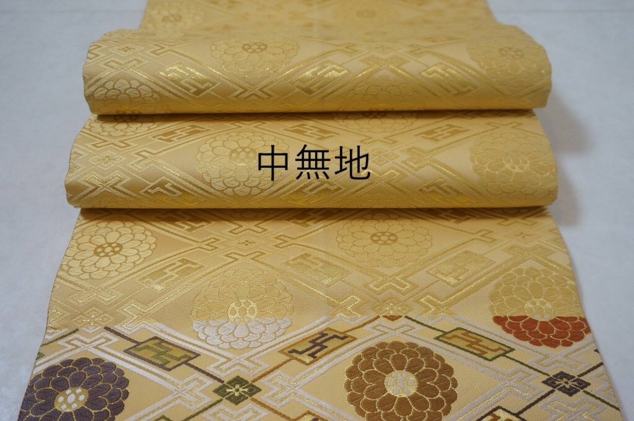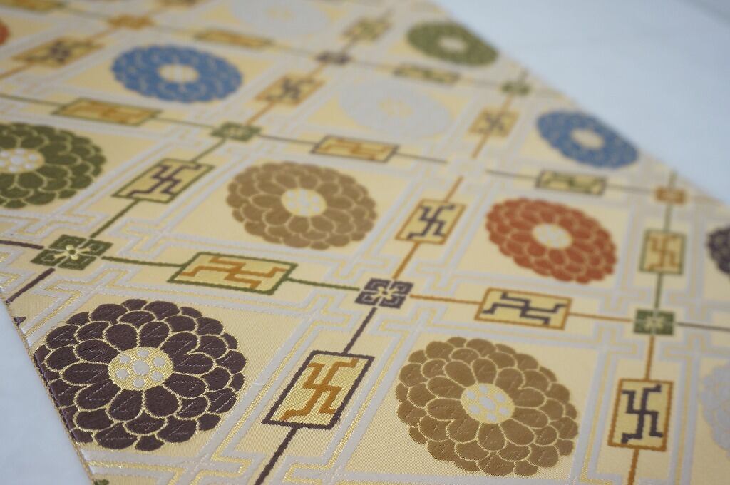 ■上品な淡黄色地に、さりげなく煌めく「金糸」や、正絹の光沢が美しい色糸を使い、ふっくらとした刺繍のような「唐織り」で、格調高い菱格子に菊を繊細に織り出しております。