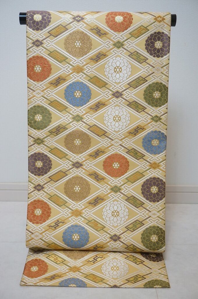 名物裂類纂 菱格子 大内菊文 唐織り 袋帯 金糸 淡黄 黄色 311