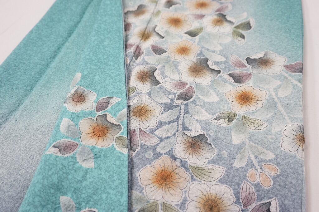 淡く深いブルーへの「ぼかし染め」で美しいグラデーションをあしらい、優美な『辻ヶ花』に「手絞り」を施し、上品に煌めく「金箔」をさりげなく散りばめた、意匠美の作品です。