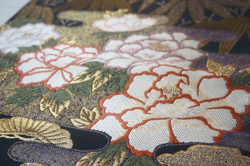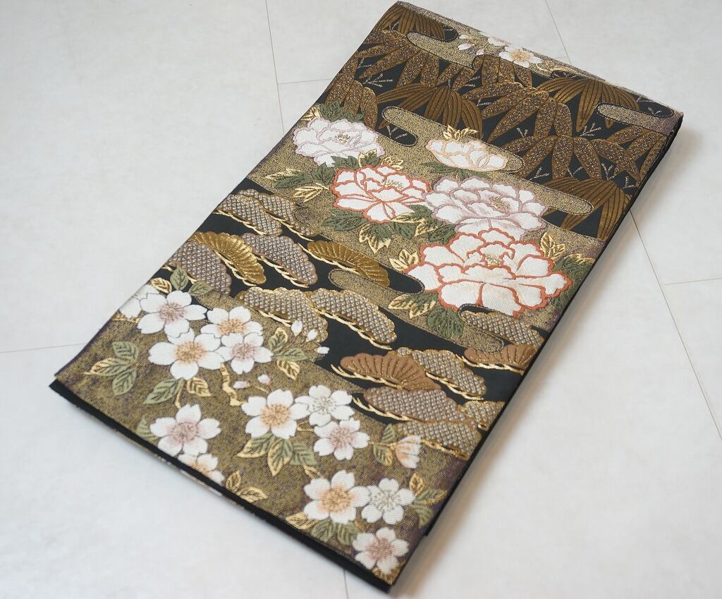 ■上品に煌めく「金糸」や、絹の艶の美しい「白糸」を使い、ふっくらとした格調高い「唐織り」で、縁起の良い『吉祥文』の松・竹・牡丹・桜を間隔良く「霞取り」で配した、とても粋な色柄です。