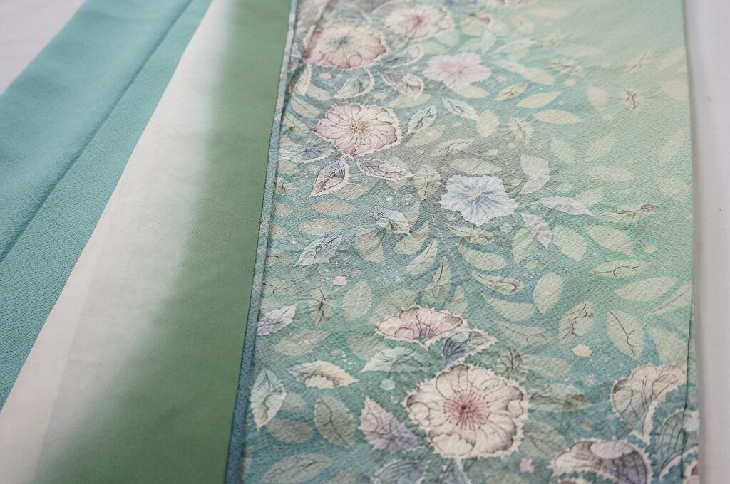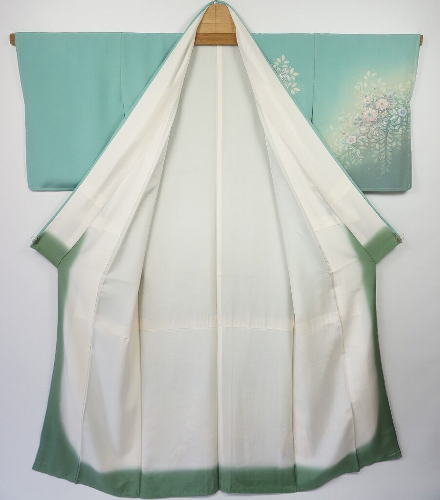 明るい黄緑から深いブルーグリーンへの「ぼかし染め」による美しいグラデーションを施し、多彩な「友禅」「墨絵書き」「手絞り」を駆使し、美しく彩られた『辻ヶ花』を優美にあしらった、うっとりするほど美しい作品です。