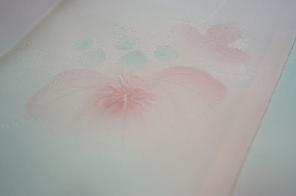・襦袢は、淡く優しい「ぼかし染め」を配し、丹念な「手絞り」を施し、やわらかくてしっとりとした心地良い肌触りで、肌に馴染む上質な「正絹」のお品です。