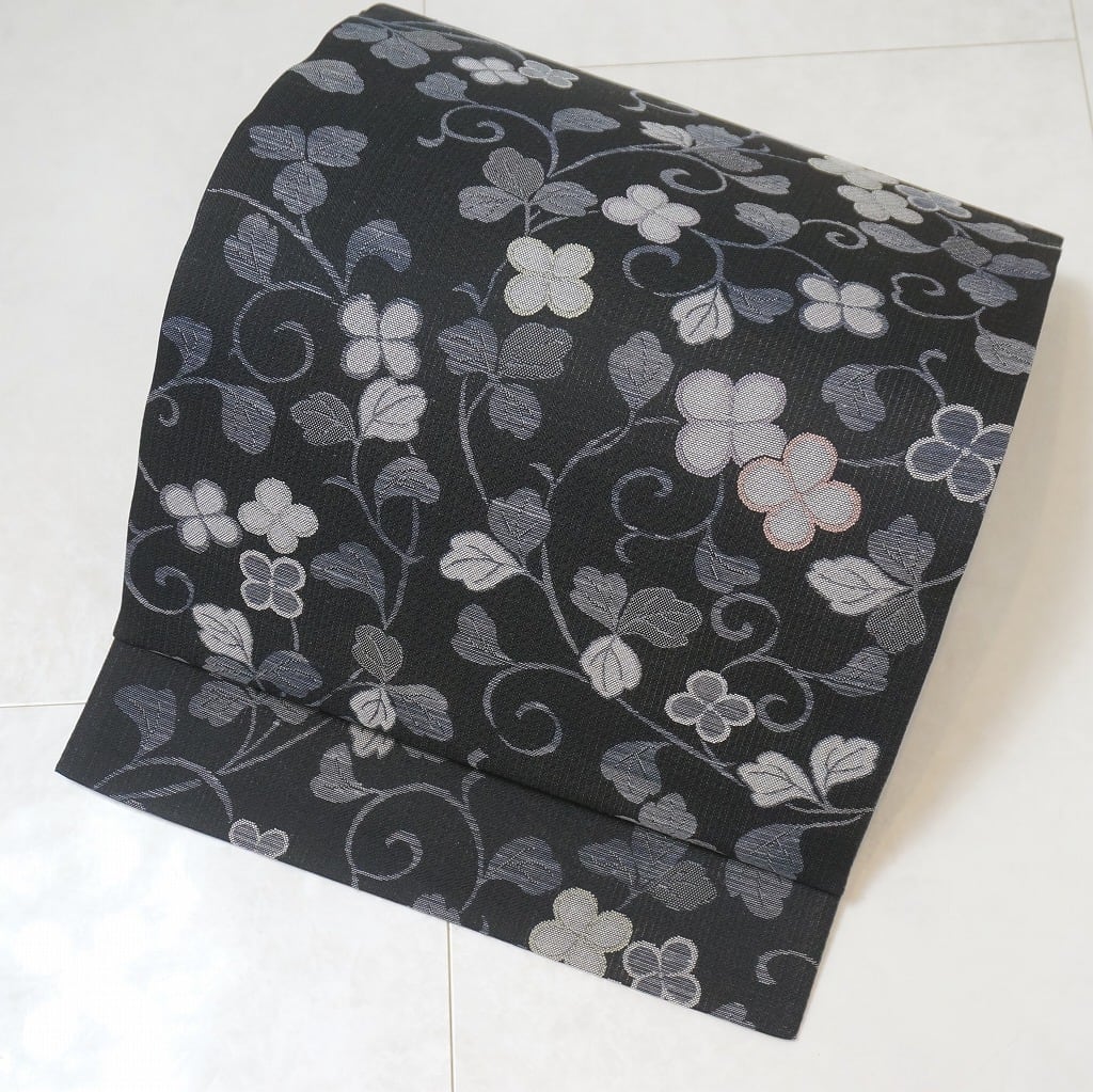 ■ほんのりとグレーがかった黒地で、若干の透け感があり涼し気に織り出され、優美な「唐草」をあしらったモダンな作品です。
