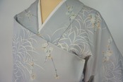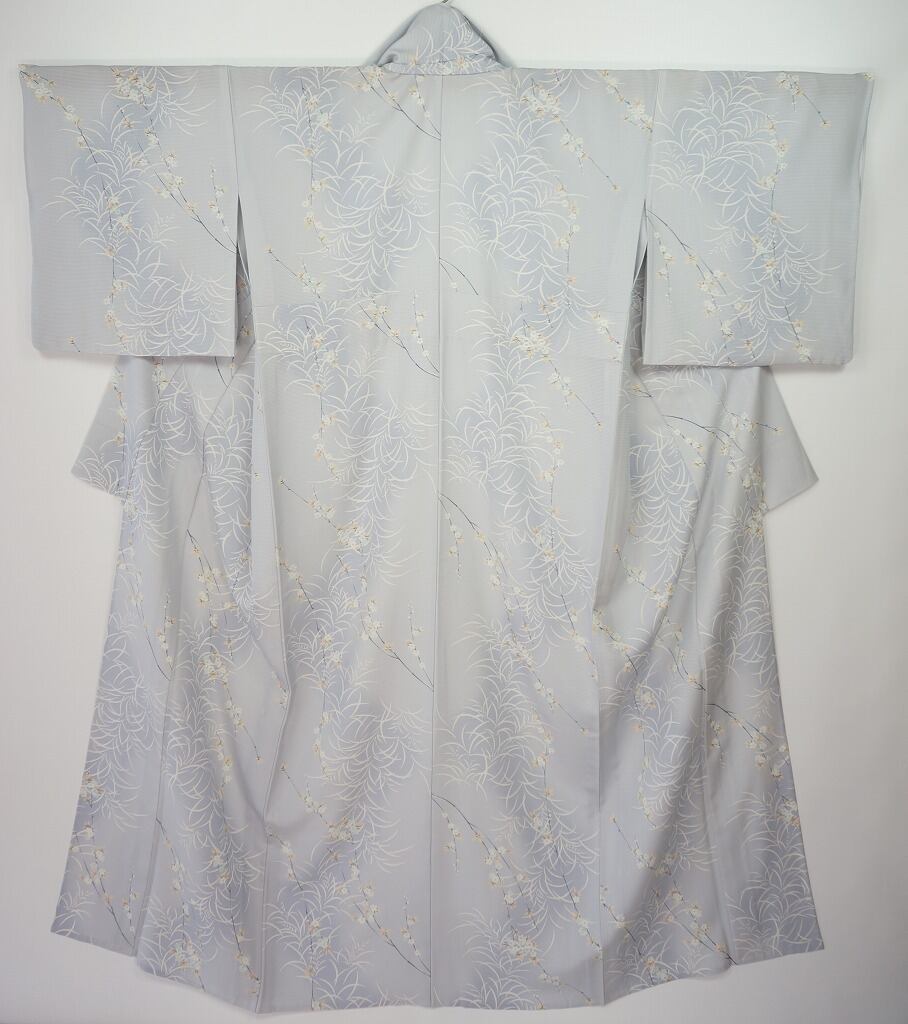 優雅に枝垂れる美しい花に草花を配し、繊細な「型染友禅」で細密に描かれております。