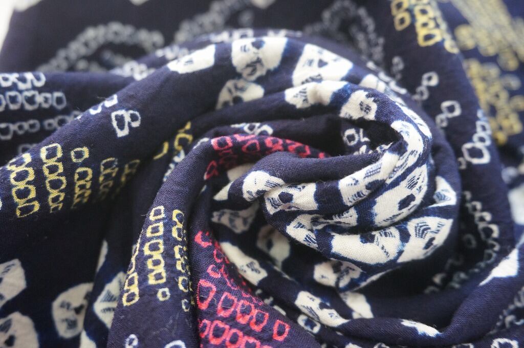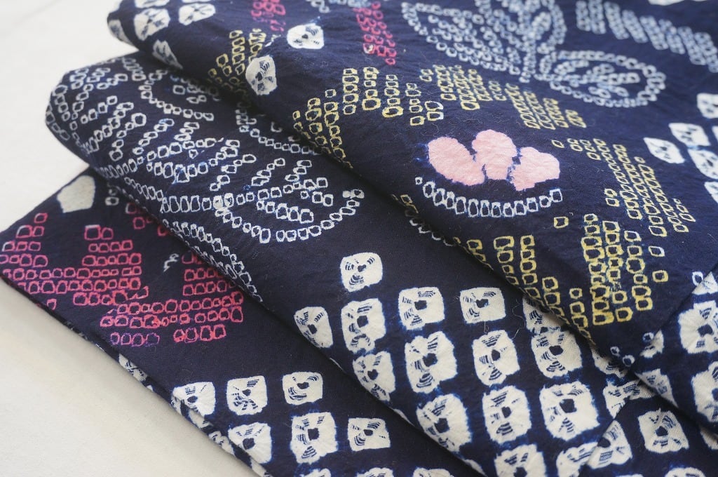 綿を藍で染めたものが代表的で、他の産地に類を見ない100種類にも及ぶ、絞りや染色の技法があります。