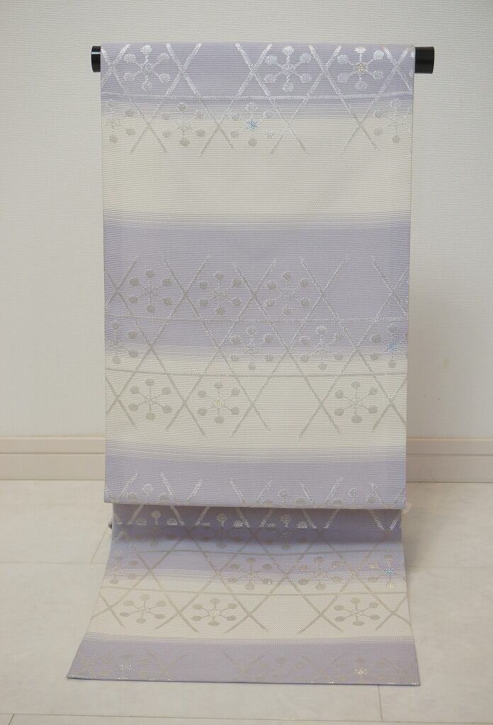 ■明るく清楚な白地に、淡く優しいパステルカラーの紫で、グラデーションの縞柄をあしらい、美しく煌めく「銀糸」でモダンな[雪の結晶]を丹念に織り出し、中心にさりげなく「金糸」や水色の箔を間隔良く配し、アクセントになっております。