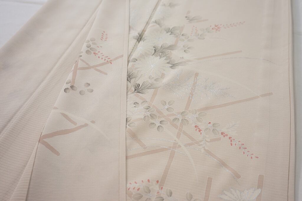 細密な「手描き友禅」で、モダンな菱垣に秋の涼しさを呼ぶ[菊][萩][すすき]などの草花をあしらい、美しく煌めく「銀彩」を配した、とても上品な色柄の訪問着です。