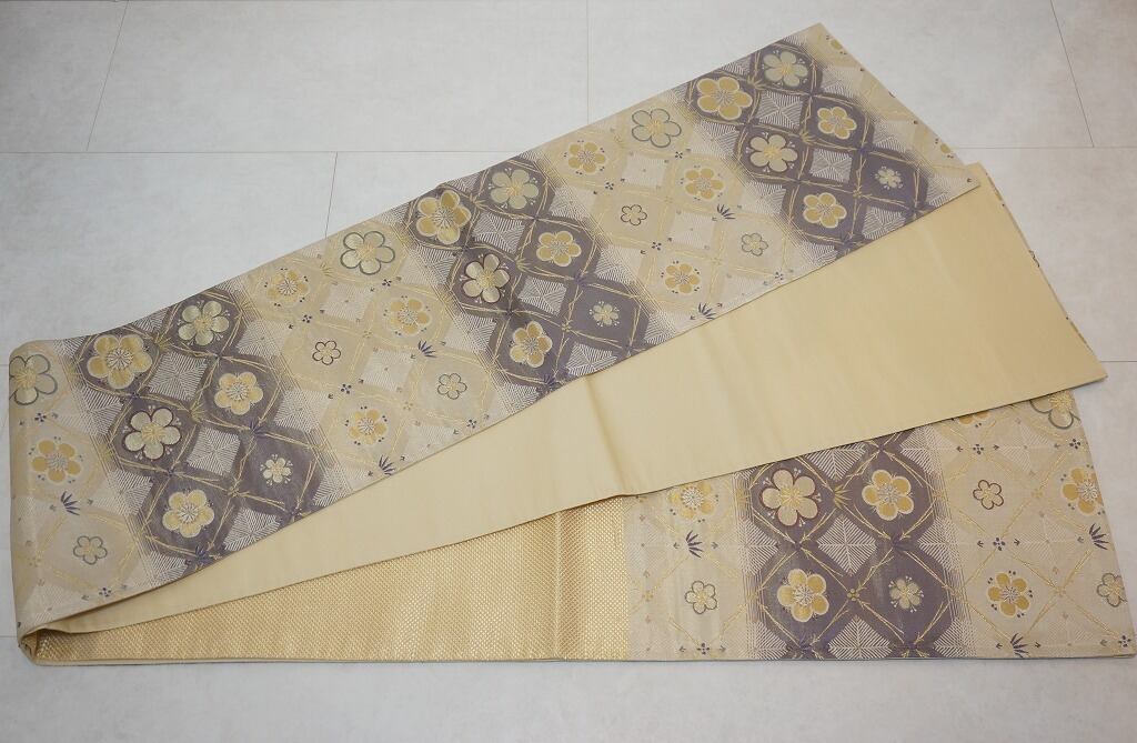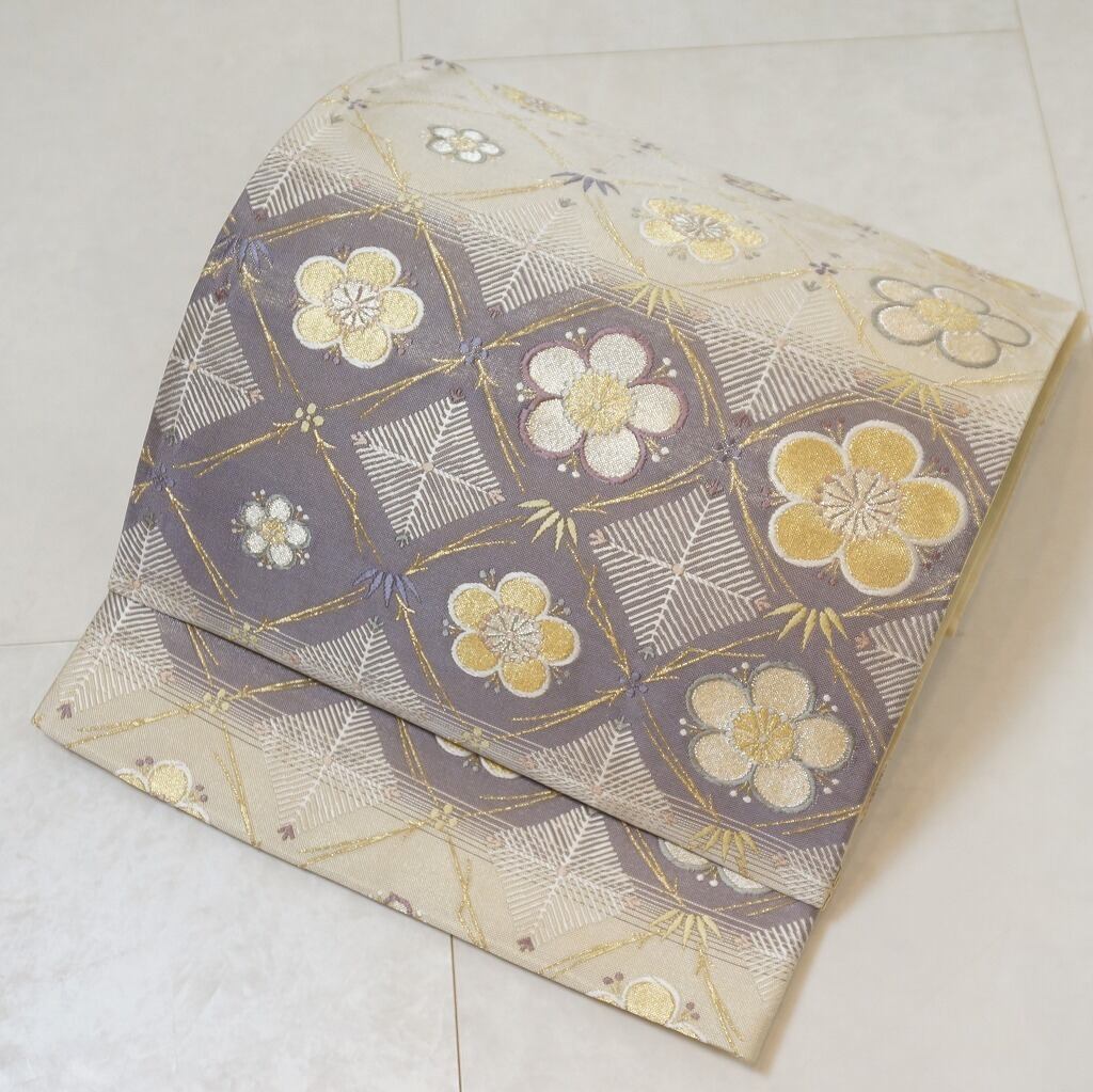■やわらかなアイボリーと紫のグラーデーション地に、金糸をきめ細かく織り込んだ「金通し」が角度により煌めき、華やぎを添えております。