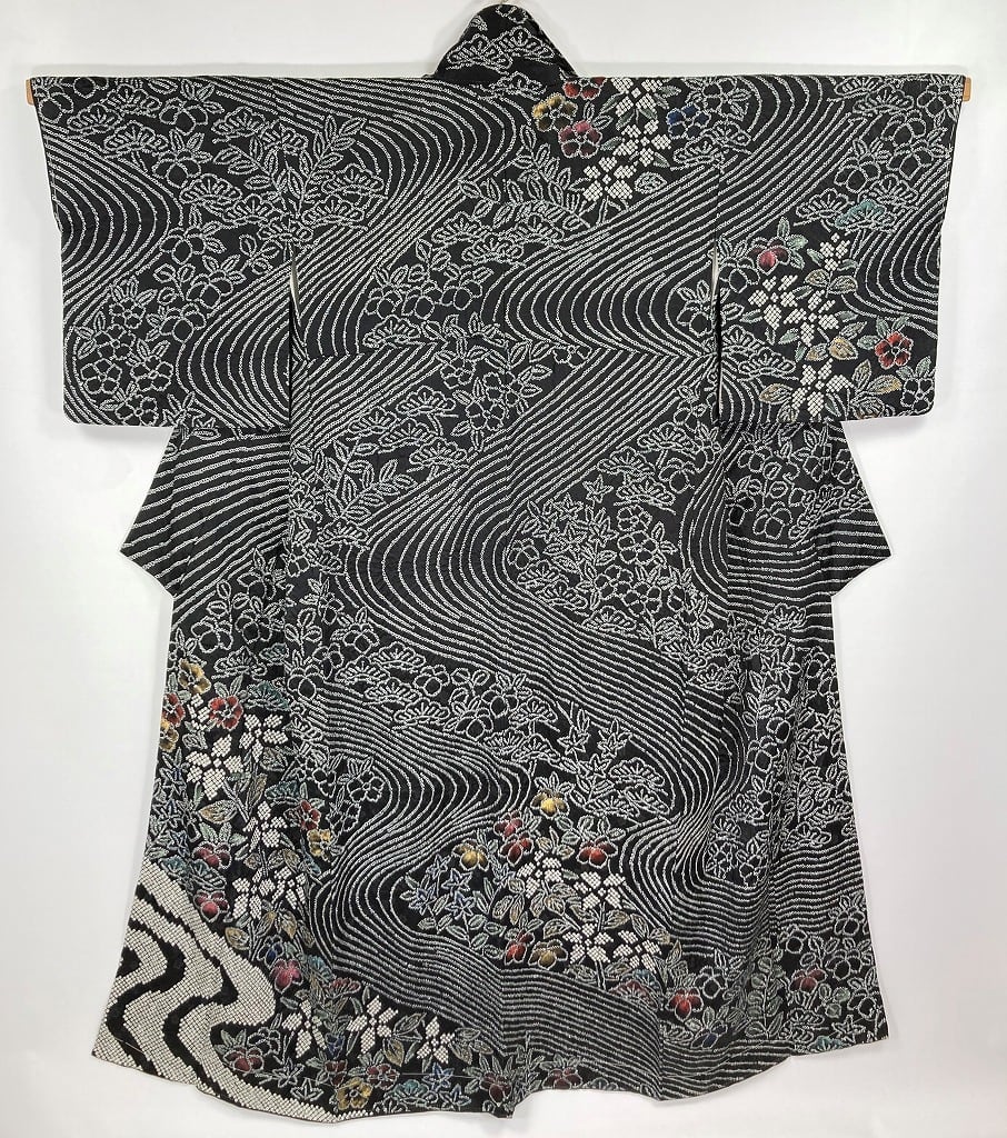 ■、ふっくらとした立体的な「京鹿の子絞り」やきめ細かな「人目絞り」で、縁起の良い「吉祥文」の松やモダンな花々が咲き乱れ、大柄の流水を大胆に配し、赤・青・緑・黄などの上品に煌めく「箔」を散りばめた、丹精込めて一粒一粒気の遠くなるような手仕事による華麗な「総絵羽」の大変素晴らしい見事な作品です。