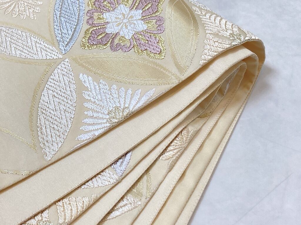 ■明るいベージュ地に、清楚な白や淡い紫・水色の艶の美しい絹糸と、気品高く煌めく「金糸」を使い、丹精込めて織り上げた手刺繍のように立体的な「唐織り」で、格調高い[七宝繋ぎ]に優雅な[花菱]を配した、大変加工の良いお品です。