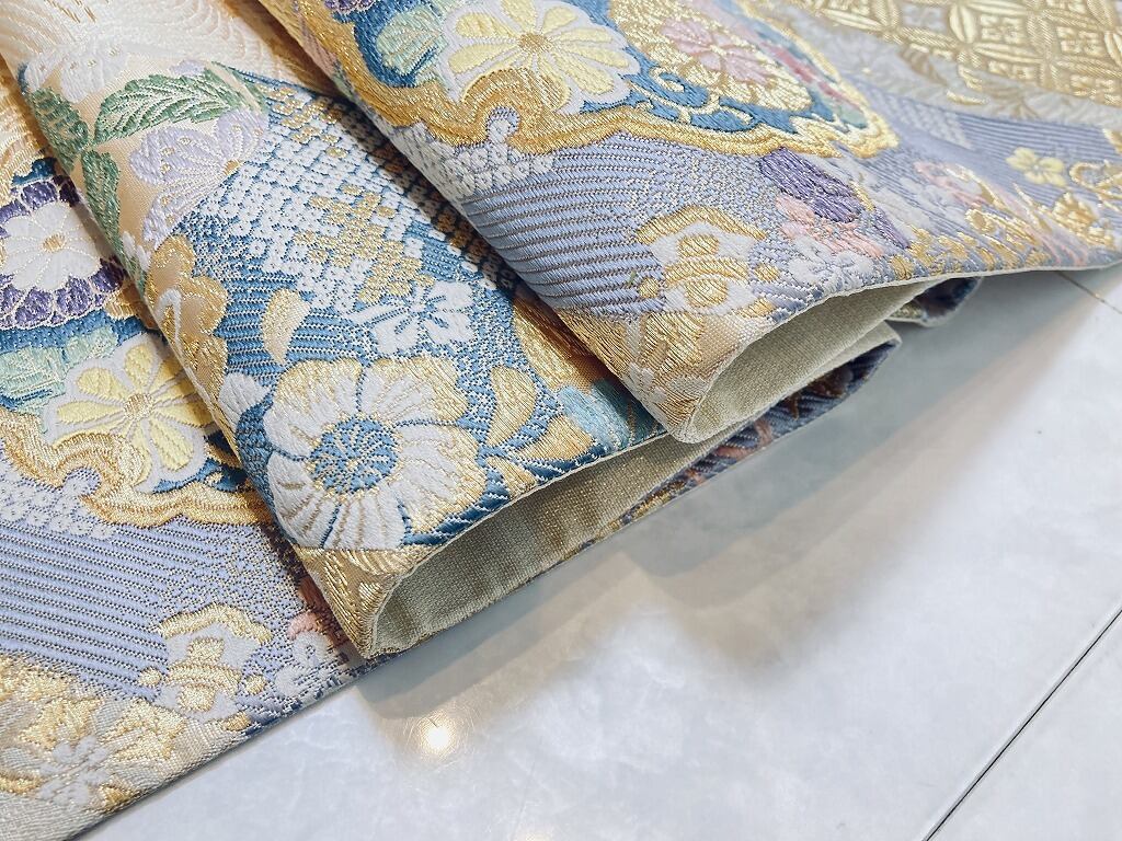 ■淡いクリーム色のような上品な地色に、清楚な「白糸」や煌びやかに輝く「金糸」をふんだんに使い、格調高い[七宝花菱]や[宝尽くし]に[辻ヶ花][華紋]などを流れる熨斗のようにスタイリッシュに配し、四季の花々を描いた[雪輪]や華紋を間隔良くあしらい、刺繍のような立体的な「唐織り」で細密に織り出した、大変加工の良いお品です。