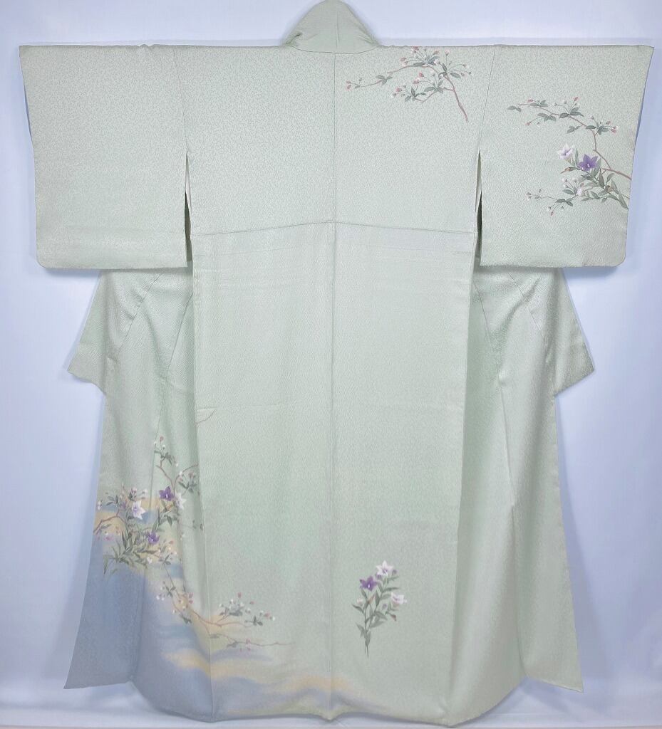 そごう謹製 手描き友禅 桔梗 訪問着 花柄 正絹 黄緑 水色 パステルグリーン 778