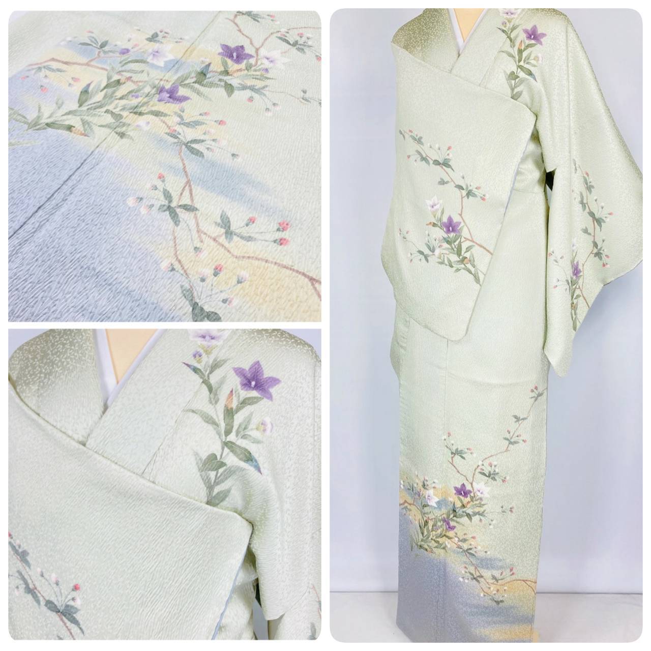 淡い水色や黄色のやわらかな「ぼかし染め」を施し、繊細な「手描き友禅」で優雅な[桔梗]をあしらった、金彩や金箔等使わずに「友禅」のみで描き上げた、とても美しい作品です。