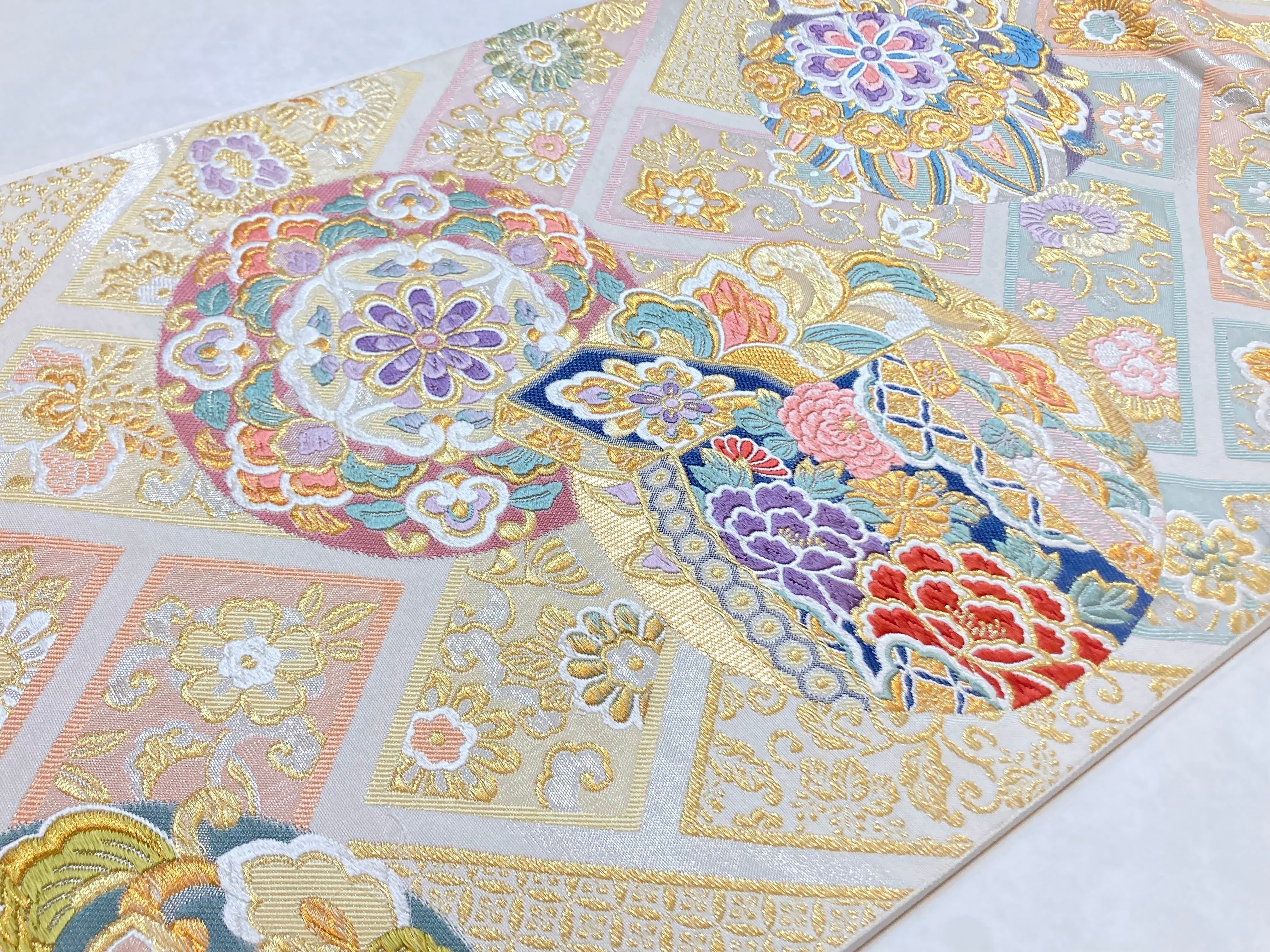 ■白地に「銀糸」をぼかし染めのように織り込み、パステルカラーピンク・紫・水色などの優しい色使いで、スタイリッシュな[檜垣取り]に花々をあしらい、エレガントな[華紋]や雅やかな[貝桶]を配し、煌びやかな「金糸」をふんだんに使い、ふっくらとした刺繍のような細密な「唐織り」で丹精込めて織り上げた、大変加工の良いお品です。
