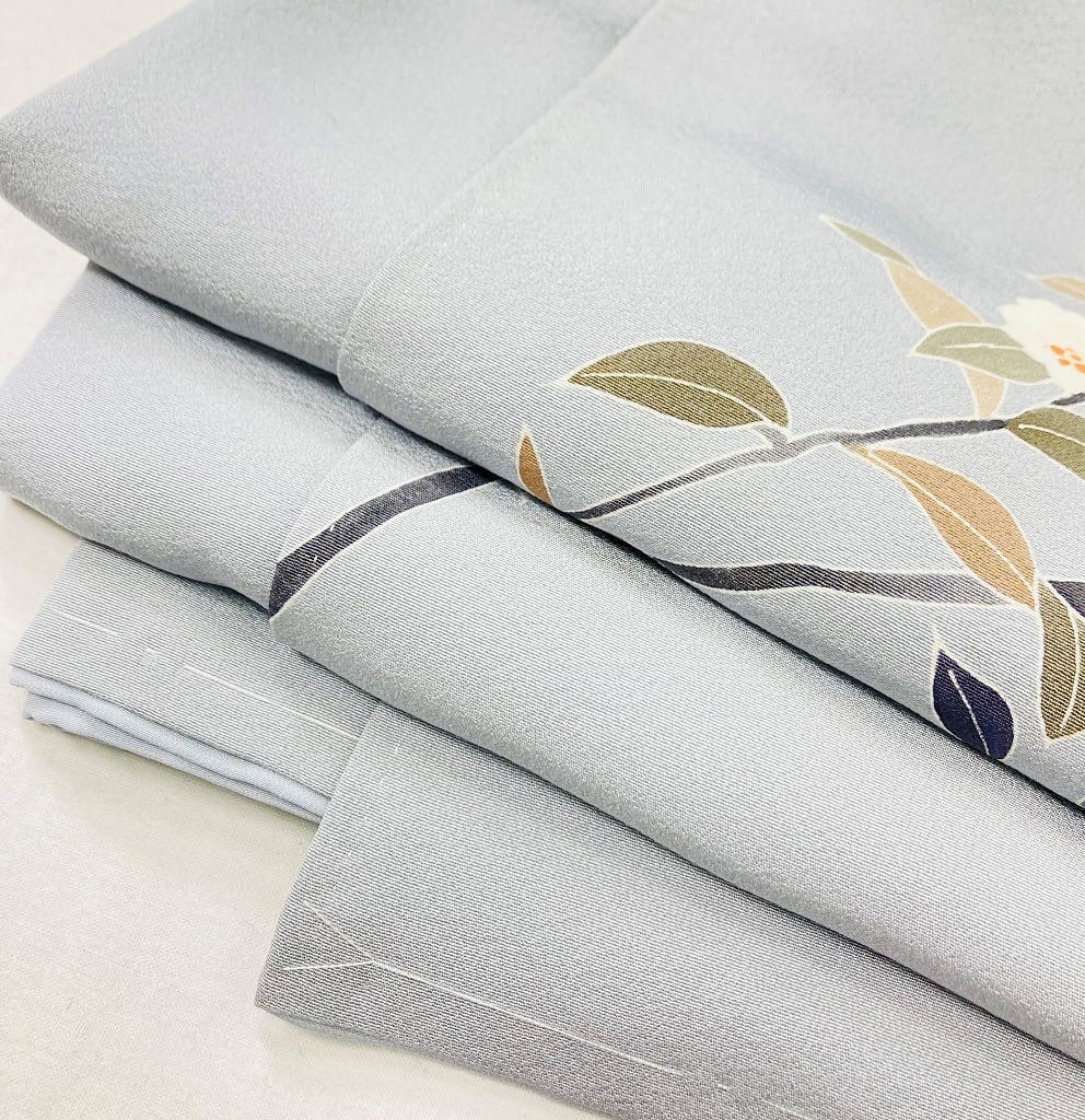 本加賀友禅 南克治 未使用 椿 訪問着 花柄 正絹 白銅色 グレー 水色 817