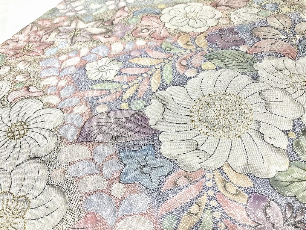 ◇煌びやかなシルバーに、淡く優しいパステルカラーのピンク・紫・水色・黄緑が目を惹く、とても素敵な袋帯です。