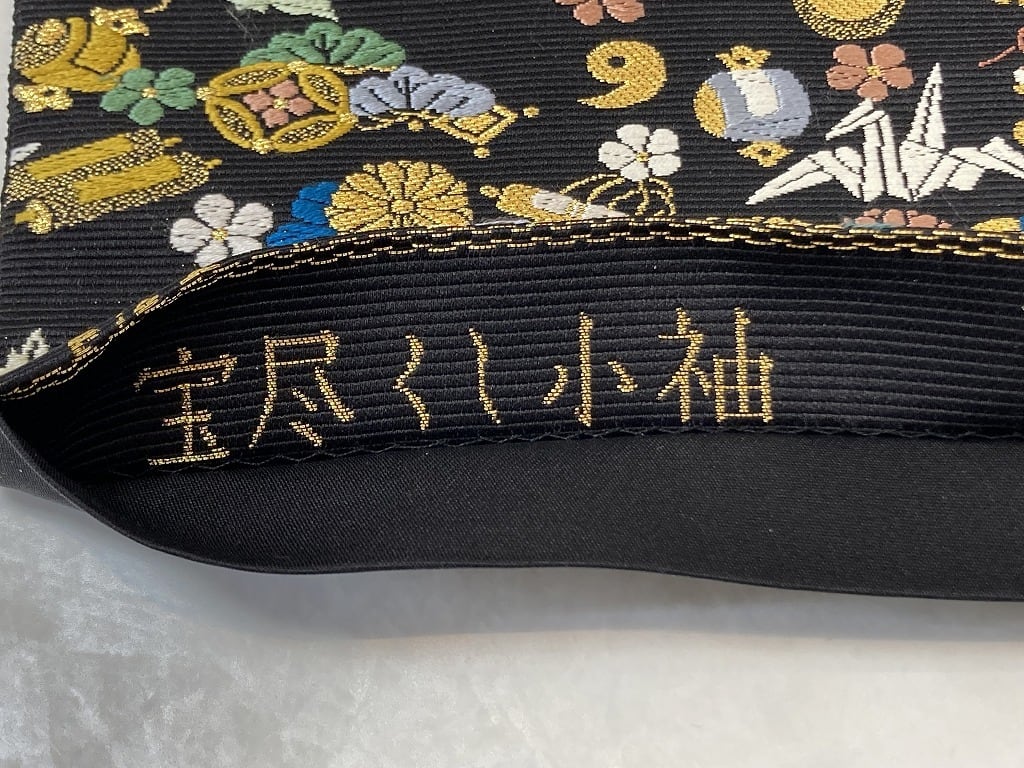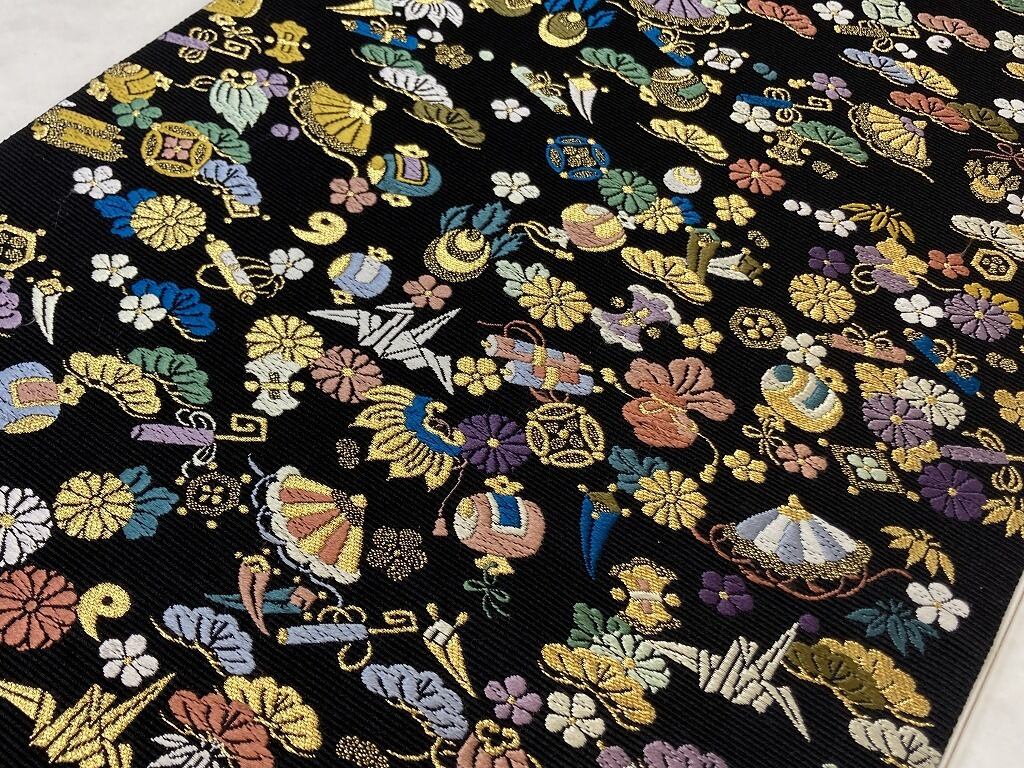 ◇黒地とのコントラストが美しい、色とりどりに彩られた[宝尽くし]に雅やかなゴールドが映える、縁起の良い「吉祥文様」づくしのとても粋な高級「西陣織」です。