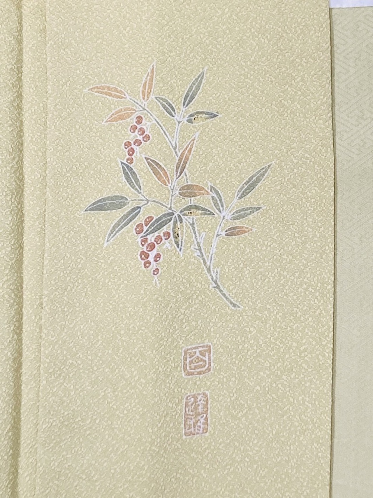 ◇右衽と八掛(着用時は隠れる部分)には、一筆一筆息遣いの聞こえる繊細な「加賀友禅」により、(難を転じて福となす)と言われている縁起の良い[南天]が描かれた、お洒落でとても粋な高級色無地です。