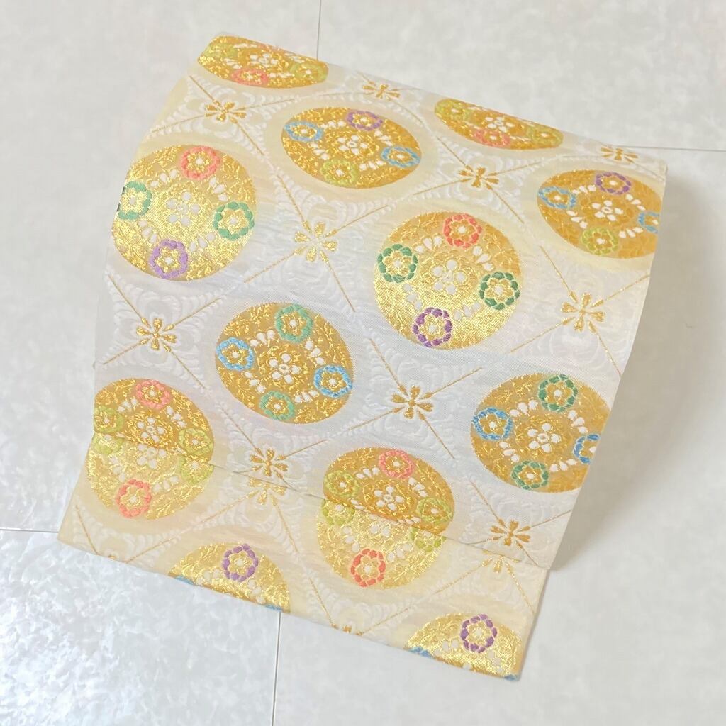 ◇優しくさりげないグラーデーション地に、白の花菱・ゴールドの丸紋が美しい、気品溢れるとても上品な袋帯です。