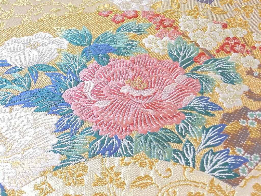 ■白地に気品高く煌めく「銀糸」を使い、桜・藤・菊・椿などの四季の花々を[斜め格子]で配し、美しく輝く「金糸」をふんだんに使い、刺繍のようにふっくらとした緻密な「唐織り」で、格調高い[雲取り]や大輪の牡丹と菊を上品な古典柄の[扇面]にあしらった、意匠美の作品です。