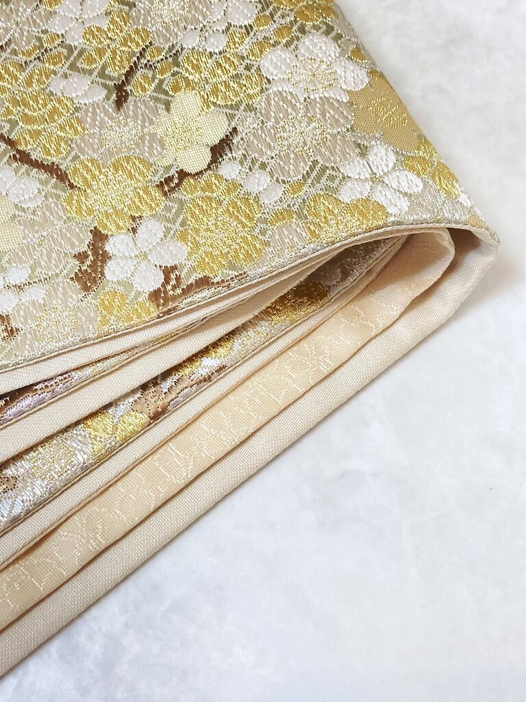 ■淡いベージュ地に、美しく煌めく「金糸」「銀糸」をふんだんに使い、刺繍のようにふっくらとした繊細な「唐織り」で、縁起の良い[吉祥文]の美しい[梅]が咲き誇り、モダンな[変わり市松]で配しております。