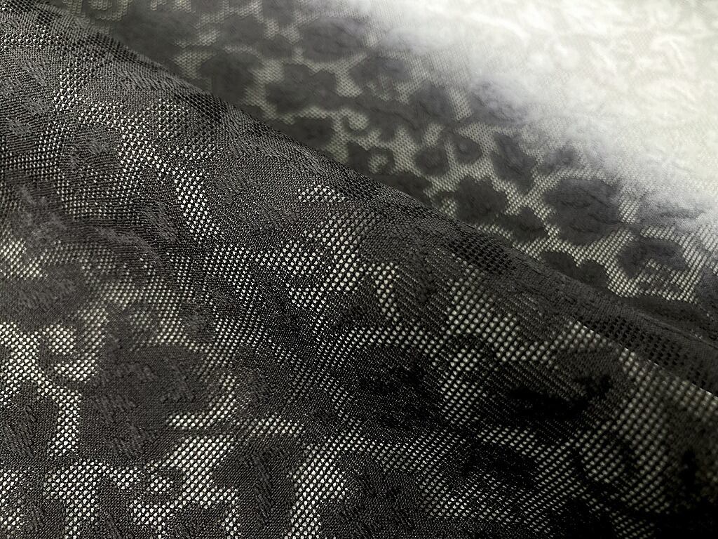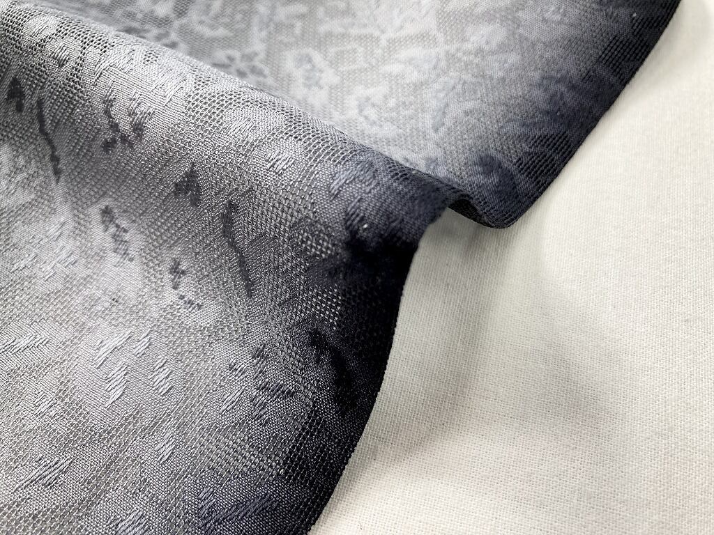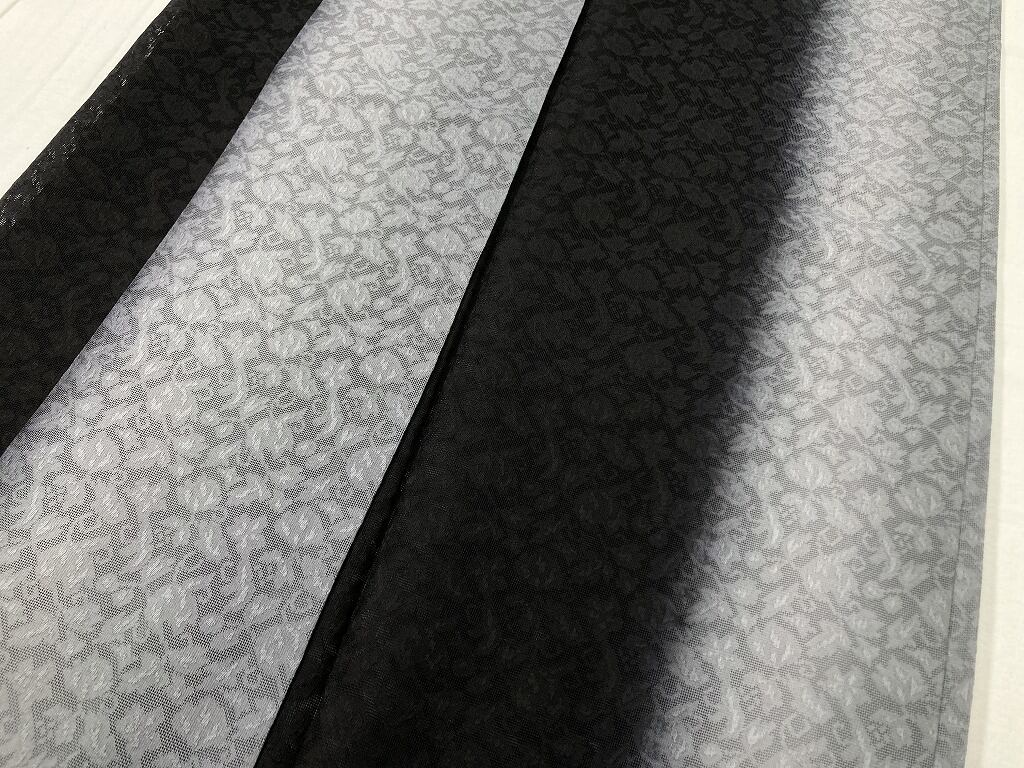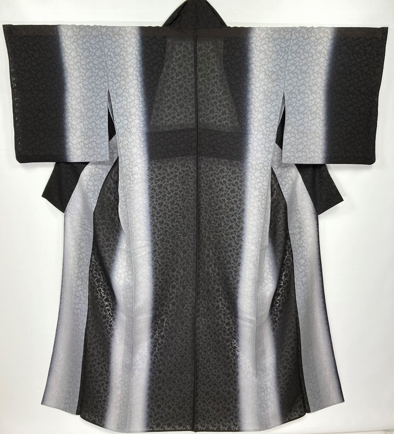 優雅な[唐花]をきめ細かく丹念に織り出した「紋紗」が美しく浮かび上がり、淡いグレーと黒の大胆な[縦縞]をスタイリッシュに配した、意匠美の大変素晴らしい作品です。
