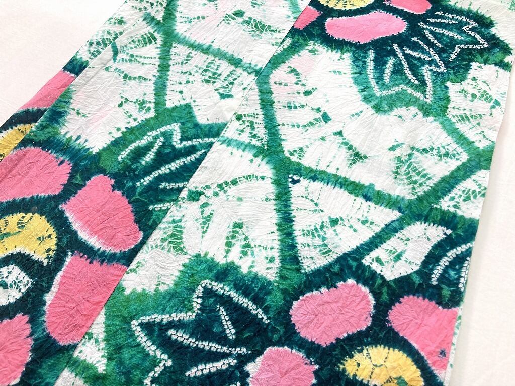 有松絞り【浴衣】希少色 花柄 綿 総絞り 緑 ピンク 黄色 040
