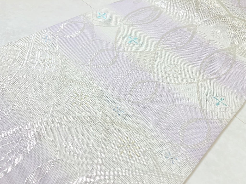 ■明るい白地に淡く優しい紫色で、グラデーションの縞柄をあしらい、美しく煌めく「銀糸」で[花菱]や西洋の宮殿のような気品溢れる模様を丹念に織り出し、美しく煌めく[ティファニーブルー]や[スカイブルー]のコントラストが華やぎを添えております。