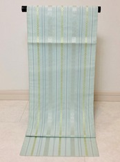 ◇透明感のあるアイズグリーンと爽やかな水色が涼やかに夏を彩る、清涼感溢れるとても素敵な博多帯です。