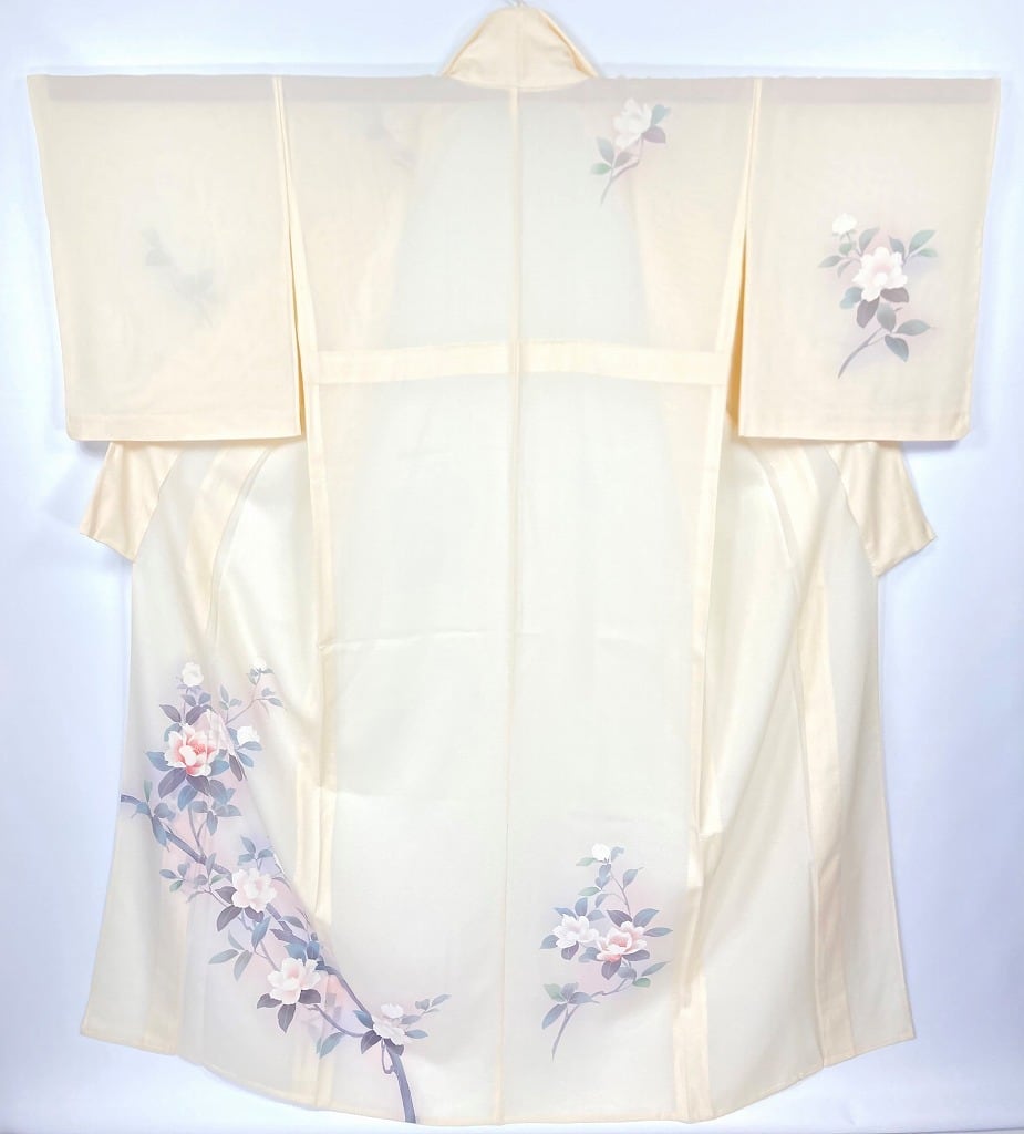 未使用【夏】手描き友禅 山茶花 絽 訪問着 正絹 黄色 クリーム 921