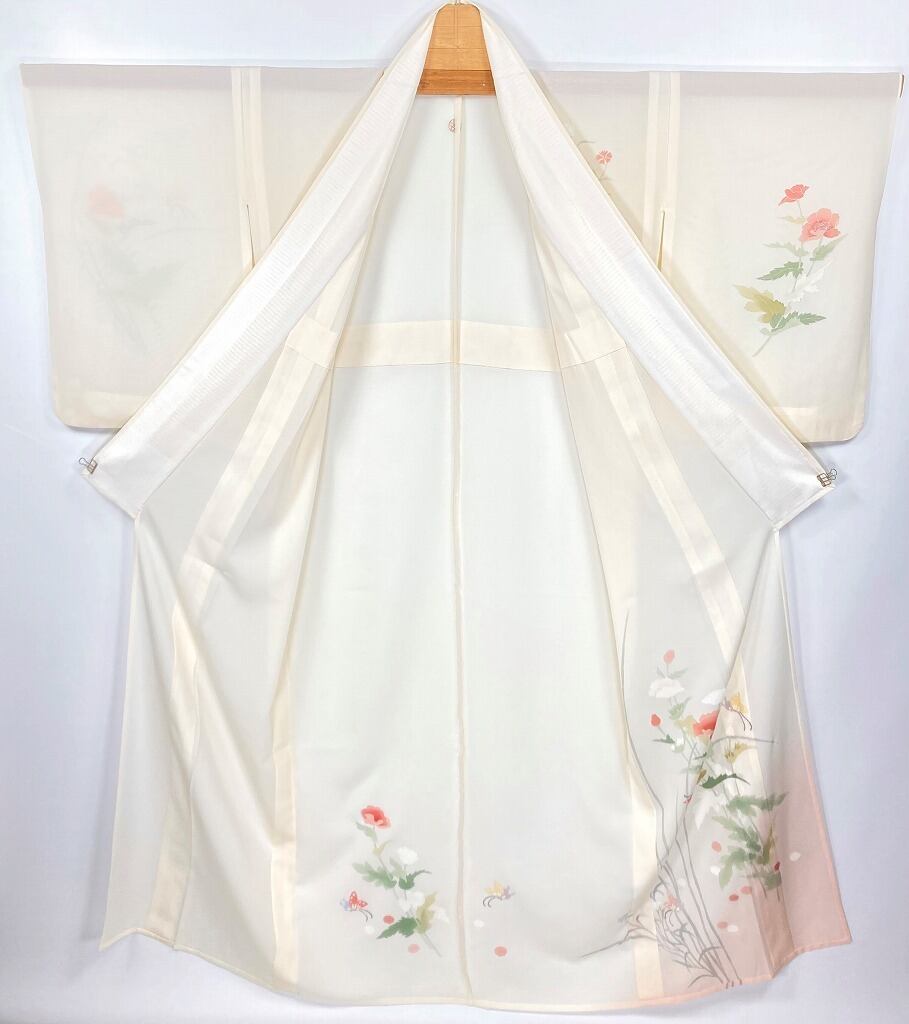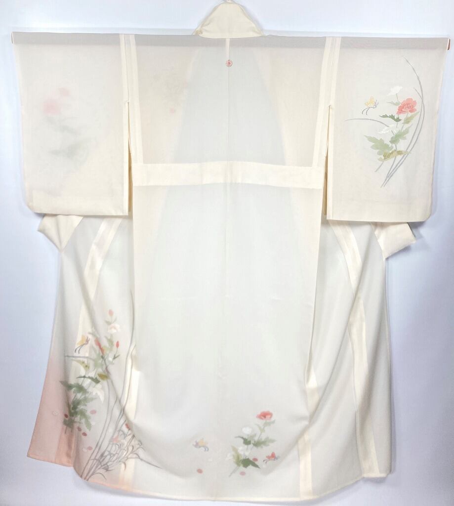 淡く優しいピンクのやわらかな「ぼかし染め」をあしらい、葉や花びら一枚一枚丹念な「手描き友禅」で、美しく彩られた[夏椿]に撫子や菊をあしらい、可愛い[蝶]が優雅に舞い、気品高く輝く「銀彩」の縁取りがさりげなく煌めき華やぎを添えた、大変加工の良いお品です。