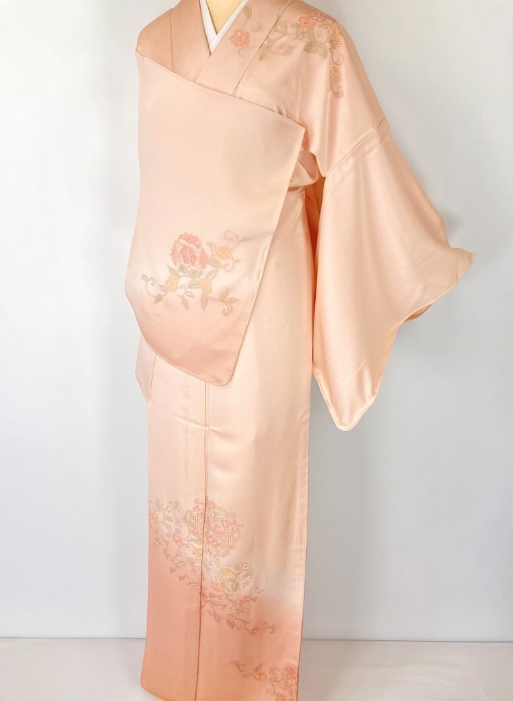少し濃いめのやわらかな「ぼかし染め」を配しメリハリが生まれ、熟練した職人の丹念な手仕事による「汕頭刺繍」や「手刺繍」で、オリエンタルな[唐花][華紋]を優雅にあしらった意匠美の作品です。