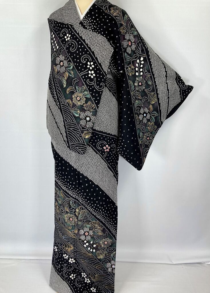 総絞り 辻が花 訪問着 鹿の子絞り ラメ 正絹 黒 白 グレー 936