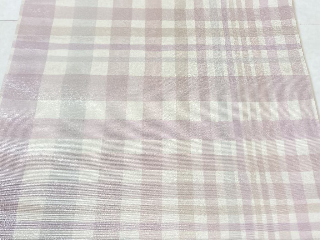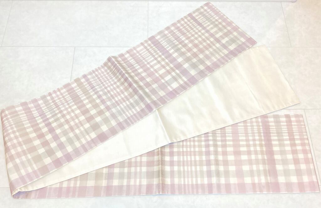 作家物 貝紫染め 未使用 洒落袋帯 全通柄 正絹 格子 チェック 白 紫 467