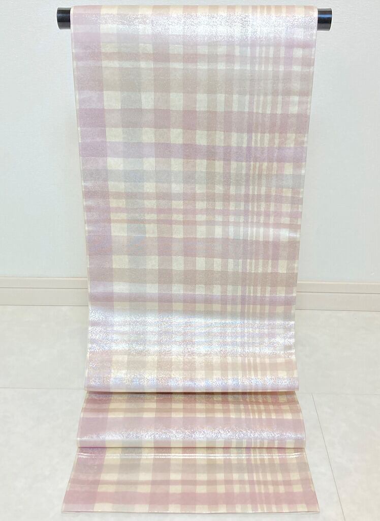 ■たいへんきめ細かく織り込んだ「銀糸」が角度により気品高く煌めき、神秘の素材と言われる貴重な『貝紫』で、不規則でダンな[格子]を美しく染め上げた、豪華な「全通柄」です。