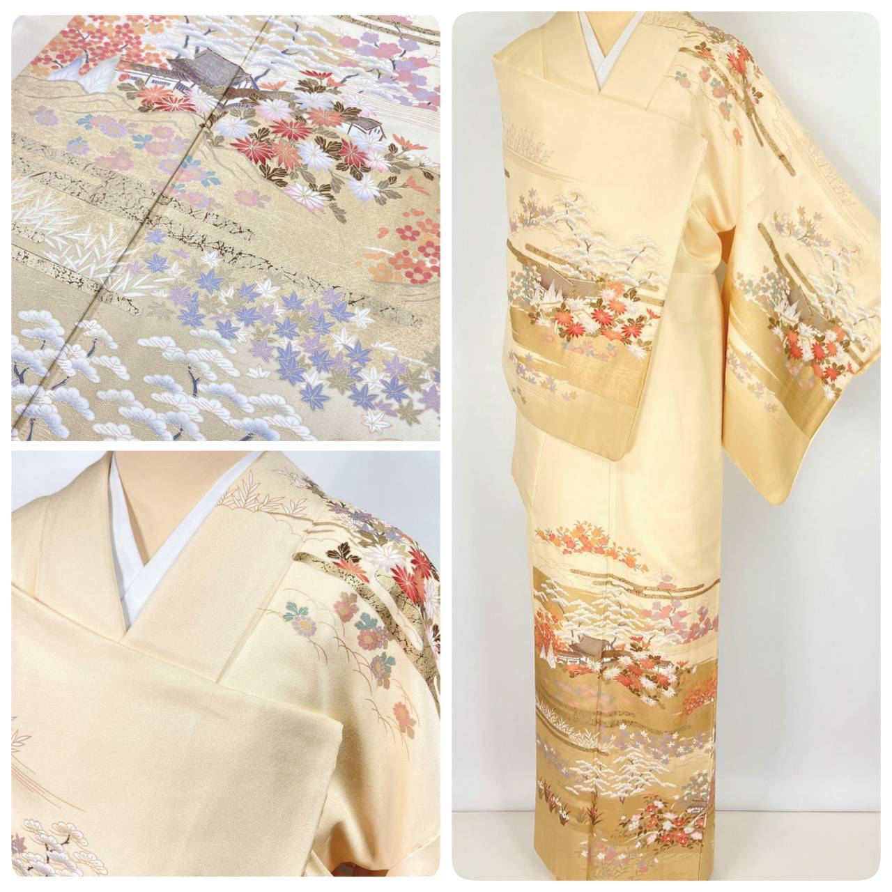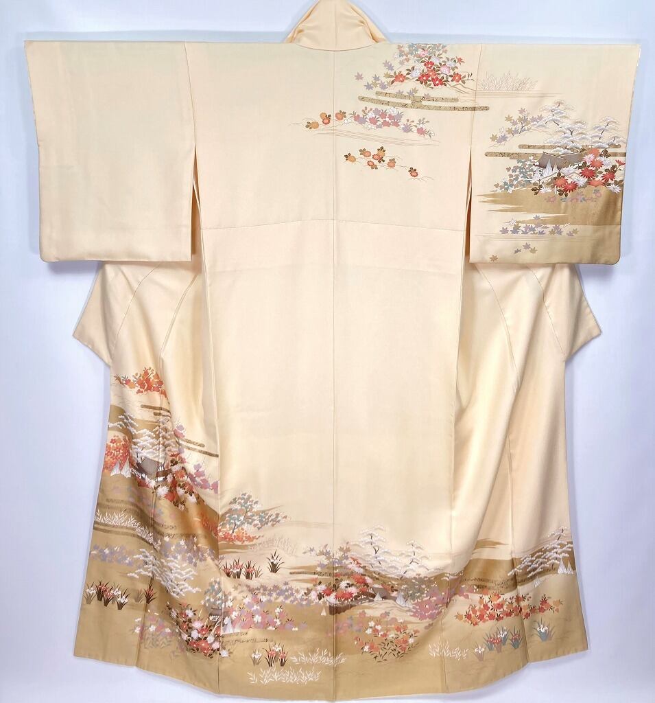京友禅 茶屋辻 金彩 四季の花々 訪問着 正絹 クリーム ベージュ 黄色 赤 953