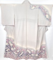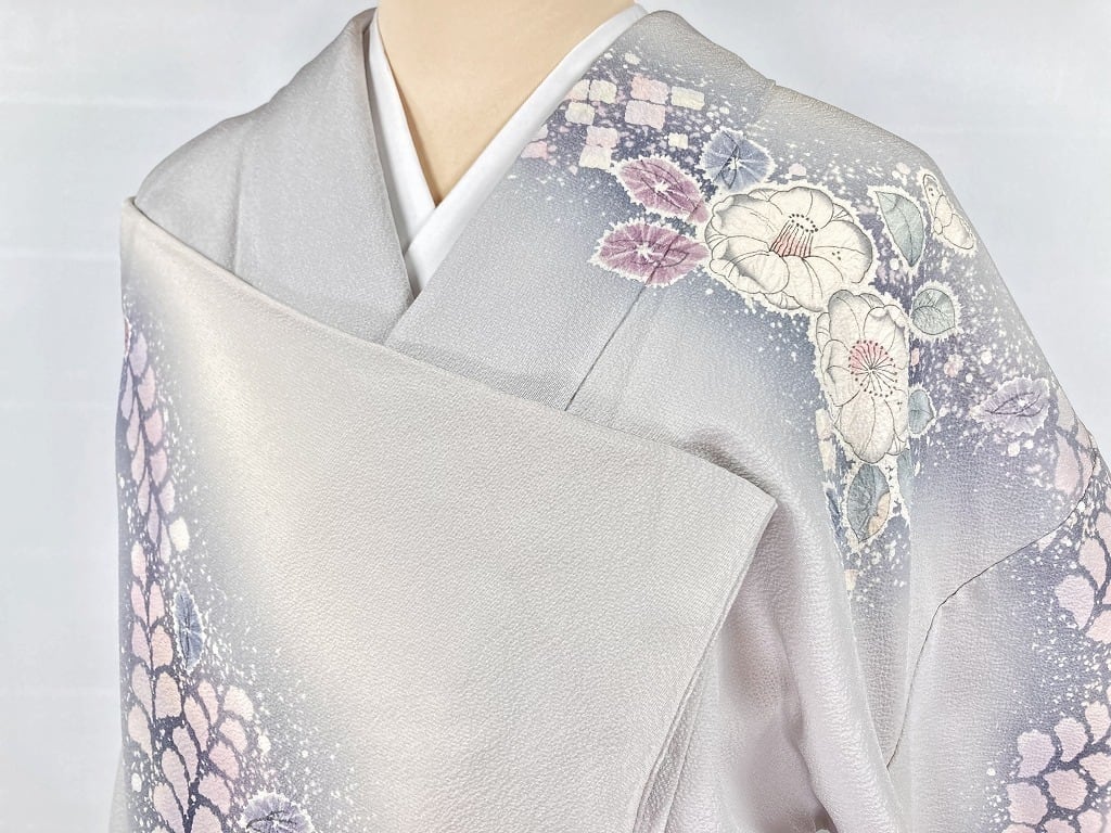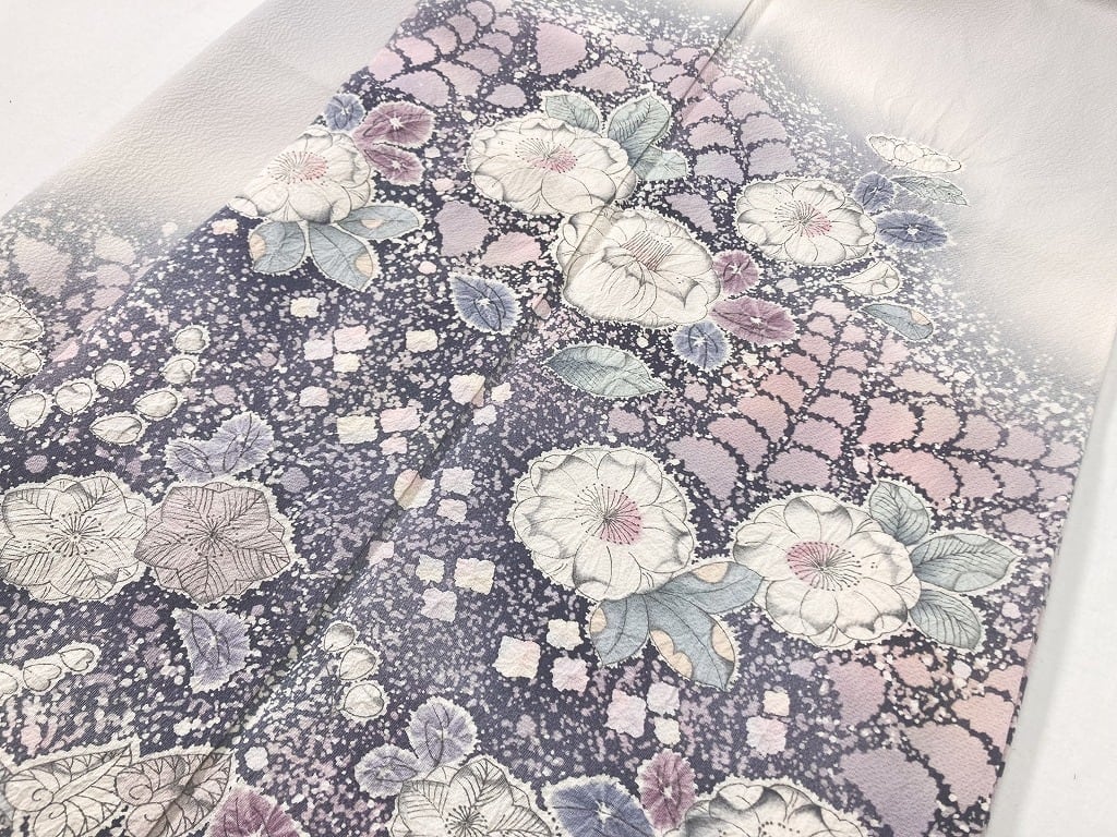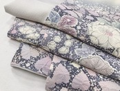 白菫の花のようなほとんど白に近くほんのりとグレーがかった紫の「白菫色」しろすみれいろ (伝統色のいろは) を淡くしたような、優しく上品な地色です。