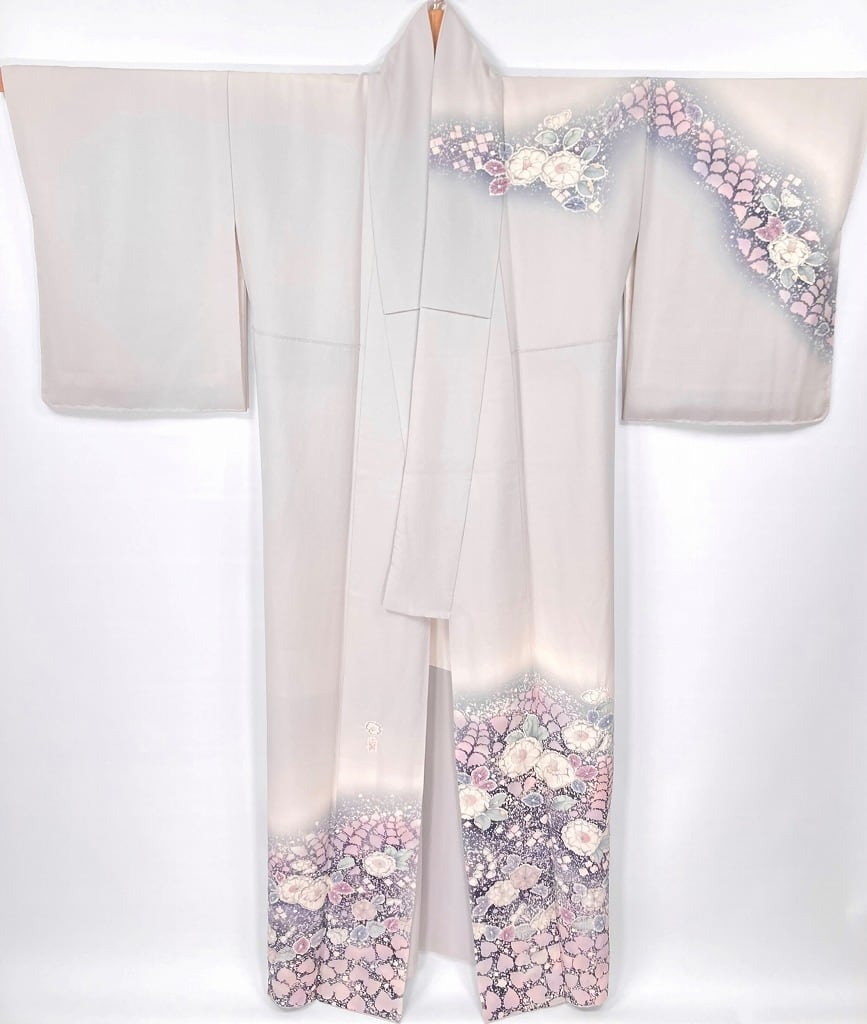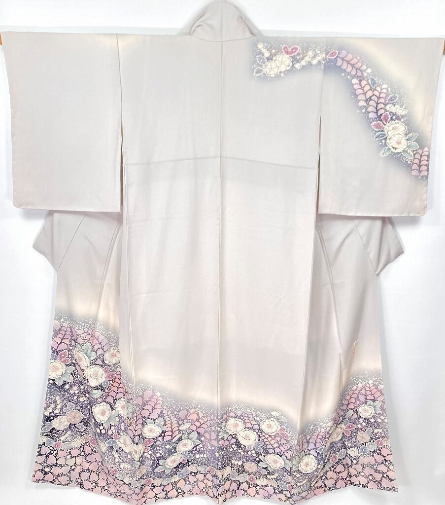 ◇淡く優しい地色とシックな色合いのコントラストに紫の[辻ヶ花]が映える、「翠山工房」が手掛けたとても素敵な訪問着です。